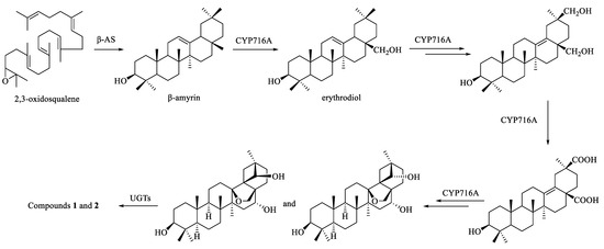 The biosynthetic pathway of compounds 1 and 2 was postulated as shown in Scheme 1. Firstly, the five-carbon building blocks, 3-isopentenyl pyrophosphate (IPP) and dimethylallyl pyrophosphate (DMAPP), were synthesized using the 2-C-methyl-D-erythritol 4-phosphate (MEP) or mevalonic acid (MVA) pathways [21]. Then, six building blocks were condensed to form C30 squalene, which is the precursor of all triterpenoids in eukaryotes. Subsequently, the linear squalene was epoxidized to 2,3-oxidosqualene. The 2,3-oxidosqualene was cyclized to the pentacyclic oleanane-type triterpenoid backbone β-amyrin by the β-amyrin synthase (β-AS). Furtherly oxidization of the β-amyrin by CYP450s introduced an oxygen atom into the specific site of their substrates to primarily form hydroxyl, carboxyl, or epoxy groups [22]. Finally, these molecules were glycosylated to triterpenoid saponins via UDP-dependent glycosyltransferase (UGTs) [23].