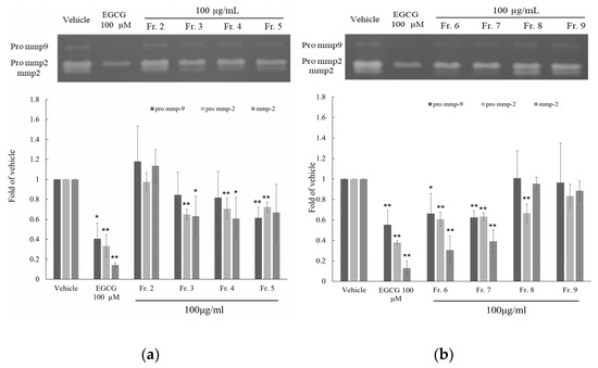 Activity effects of PMLEF fractions (Fr.2~Fr.9) on MMP-2, Pro MMP-2 and Pro MMP-9 in HT1080 human fibrosarcoma cell, and use EGCG as positive control. (a) PMLEF Fr.2~5 (b) PMLEF Fr.6~9 indicates significant differences from the vehicle. p-values were derived from one-way ANOVA with Student-Newman-Keuls Tests. * p-value < 0.05, ** p-value < 0.01.