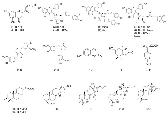 - Fang, J.M.; Su, W.C.; Cheng, Y.S. Flavonoids and stilbenes from armand pine. Phytochemtstry 1987, 27, 1395–1397. [Google Scholar] [CrossRef]