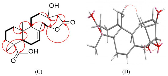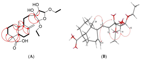Based on the COSY experiment, the protons at δH 1.83, 1.96 (H-6) and at δH 1.28 (H-5), δH 1.84, 2.36 (H-7) were found to be correlated; the protons at δH 1.52 (H-2) were correlated with δH 1.07, 1.81 (H-1) and δH 1.01 (H-3) (Figure 5A and Figure S3); The protons at δH 1.51 (H-9) was correlation between δH 1.47, 1.83 (H-11); and the proton δH 4.96 (H-15) was correlated to δH 3.91 (H-14) (Figure 5A and Figure S3). In the HMBC experiment, the methyl group at δH 1.20 was found to be correlated with the carbons at δc 44.4 (C-4), 38.2 (C-3), and 56.6 (C-5) (Figure 5A and Figure S6); oxymethylene group δH 3.51, 3.77 (H-17) was found to be correlated with the carbons at δc 15.4, 109.2 (C-15), δH 3.45, 3.74 (H-19) was found to be correlated with the carbons at δc 15.4,107.3 (C-16); δH 3.91 (H-14) was found to be correlated with the carbons at δc 81.5 (C-13), 109.2 (C-15), 107.3 (C-16) (Figure 4A and Figure S6). According to the above NMR analysis, the planar structure of compound 18 is shown in Figure 4. The methyl group (H-24) on C10 of compound 18 is affected by the isotropic acid on C4 at high magnetic fields (δH 0.75) (Figure S1). The δH 0.57 determined from NOESY spectra correlates with δH 1.83 at C-11, indicating that -COOH and H-9 are in the β-orientation (Figure S4). The proton δH 3.91 of H-14 is correlated with δH 1.44, 1.75 of H-12 and δH 4.96 of H-15, indicating that the hydroxyl group of C-13, C-14 and the ethoxy group of C-15 are all in the β-direction (Figure S4). Therefore, the three-dimensional structure of compound 18 is shown in Figure 4.