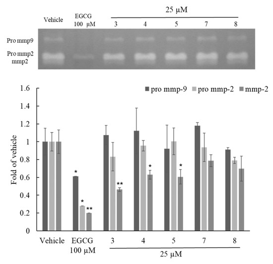Due to the potential anti-aging effects of flavonoids, our focus was on screening the flavonoid compounds in the active fraction for their anti-aging activity [18]. The cell viability of compounds 3, 4, 5, 7, and 8 was evaluated through MTT assay at a concentration of 25 μM for 24 h, showing no cytotoxicity. Subsequently, the effects of these flavonoid compounds 3, 4, 5, 7 and 8 at a concentration of 25 μM on MMP-2, Pro MMP-2, and Pro MMP-9 were evaluated using zymography. As per the results, as shown in Figure 6, compounds 3, 4, and 5 exhibited significant inhibitory effects on MMP-2, with inhibition rates of 0.46 ± 0.05, 0.63 ± 0.08, and 0.60 ± 0.07, respectively. Among them, compound 3 demonstrated a particularly remarkable inhibitory effect. None of the five compounds exhibited significant inhibitory effects on Pro MMP-2 and Pro MMP-9. (Figure 6) The inhibitory activity on MMPs indicated the potential anti-aging effect of these compounds.