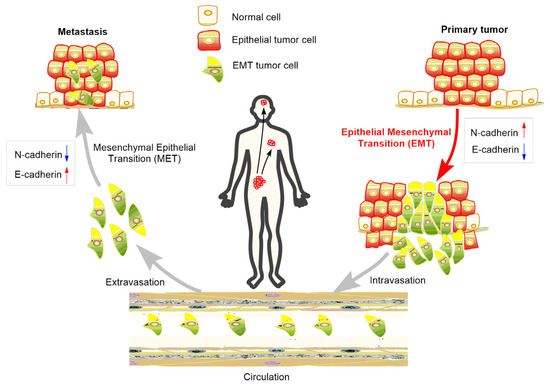 At the initial stage of EMT, malignant epithelial cells in the primary tumor obtain the ability to lose their cell-cell connections and detach from the primary tumor. The detached cells or cell clusters acquire characteristics of mesenchymal-like cells, break through the basement membrane, invade surrounding tissue, and gain access to blood vessels to achieve spread and dissemination [24]. The acquired mesenchymal properties assist the survival of cancer cells in the circulation and, in addition, provide resistance to cell death signals. When the circulating tumor cells arrive in a distant position of the body with a suitable micro-environment, the spreading cells pass through the blood vessels again and colonize to form metastases [25] (Figure 2). As a consequence, suppressing EMT in cancer cells or developing anti-EMT adjuvants emerge as attractive strategies for cancer treatment.