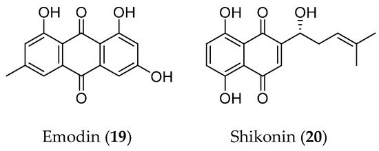 Quinones are compounds that contain intramolecular unsaturated cyclic diketones in their structures. Quinones can be further divided into benzoquinone, naphthoquinone, phenanthraquinone, and anthraquinone. Two well-known phytochemicals, anthraquinone emodin (19) and naphthoquinone shikonin (20), were demonstrated to regulate the EMT process in several kinds of cancer cells [108] (Figure 6).