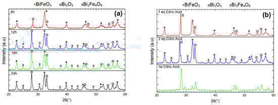 X-ray diffractograms of BiFeO samples resulting from (a) different hydrothermal treatment times (b) different metal/citric acid ratios.