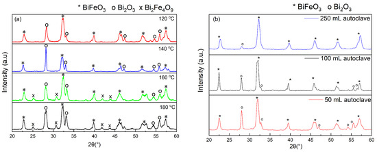 X-ray diffractograms of BiFeO samples resulting from different (a) hydrothermal treatment temperatures and (b) autoclave sizes (pressures).