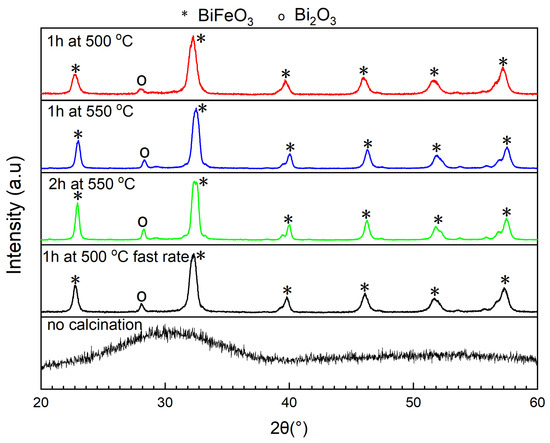 Finally, the influence of different calcination conditions was analyzed. The X-ray diffractograms of the samples calcined with different calcination paths are shown in Figure 3. All samples were calcined with an intermediate temperature plateau at 200 C for 2 h in order to ensure complete drying of the powder and in order to avoid unwanted combustion reactions [37]. As indicated by a better signal-to-noise ratio and by the better resolution of (104) and (110) peaks, the sample calcined for 1 h at 500 C with a fast heat rate of 4 C per minute is preferred due to it higher crystallinity.