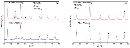 As mentioned above, one of the general obstacles in the synthesis of BiFeO-based materials is to obtain a pure phase material with the desired morphology. In order to purify the synthesized BiFeO hollow spheres, the samples were washed with 2M acetic acid as well as 2M nitric acid. After vigorous stirring for approximately 12 min, the precipitate was collected by means of centrifugation and washed several times with de-ionized water. The effect of the performed washing on the purity of the sample is shown in Figure 6. As shown in Figure 6, the quantities of both unwanted phases, i.e., BiFeO and BiO, are significantly reduced. As reported by various other research groups, remaining BiFeO and BiO impurities can be completely removed by additional acid washing in order to obtain phase pure BiFeO. In the present case, when BiO is the only secondary phase, phase pure BiFeO is easily obtained by washing the sample with acetic acid (see Figure 6b).