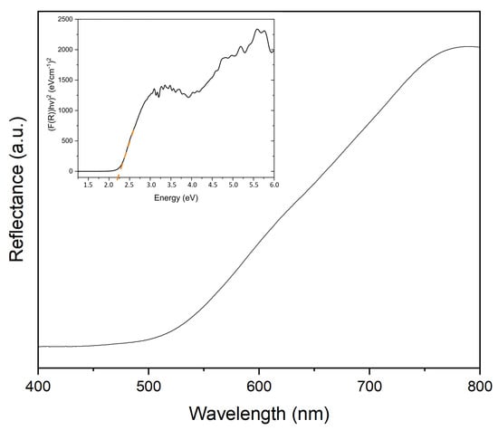 The structure and phase purity of the synthesized materials were characterized using a Bruker D2 Phaser X-ray diffractometer with a Å copper tube. Using the DIFRACC.EVA V4.3.1.2 software, a semi-quantitative analysis of the diffraction pattern was performed to identify secondary phases. The morphological analysis of the sample was performed using scanning electron microscopy and energy-dispersive X-ray spectroscopy. A field emission electron microscope MIRA 3, TESCAN equipped with a Bruker X-Flash 6–30 detector with a resolution of 123 eV in Mn K was used. The diffuse reflectance spectrum was measured by UV-Vis spectroscopy (Perkin Elmer, Waltham, MA, USA) with 200–1000 nm with an integrating sphere. These spectra were transformed by a Kubelka–Munk model in order to estimate the band gap value.