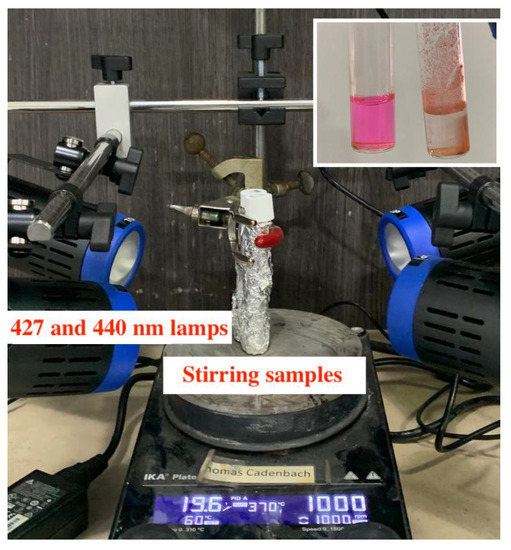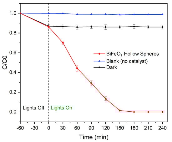 The photocatalytic activity of the synthesized BiFeO hollow spheres was evaluated in photocatalytic degradation reactions using Rhodamine B as a model organic pollutant using visible light (427 nm, 440 nm). A typical reaction setup is depicted in Figure 9.