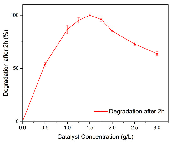 In order to analyze the effects of the catalyst concentration on the degradation reactions, we performed a series of photocatalytic experiments varying the concentration of the catalyst from 0 to 3 g/L. Figure 11 shows the dependence of the catalyst concentration on the degradation of Rhodamine B after 2 h. For low concentrations, the removal percentages significantly decreased due to the lack of active sites that trigger the photocatalytic reactions. As the concentration increases, a region of high photocatalytic efficiency (1 g/L–1.75 g/L) is reached peaking at a catalyst concentration of 1.5 g/L. When the concentration is increased further, the removal efficiency decreases as a result of an increased opacity of the suspension, which is in agreement with previously reported findings. Thus, the optimal concentration of BiFeO hollow spheres as photocatalyst for the degradation of Rhodamine B is 1.5 g/L, leading to complete degradation of the organic pollutant in 2 h.