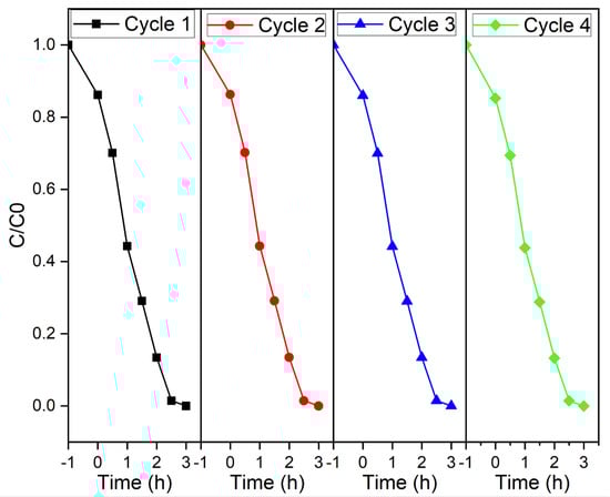 Removal of Rhodamine B using BiFeO hollow spheres in four consecutive cycles.
