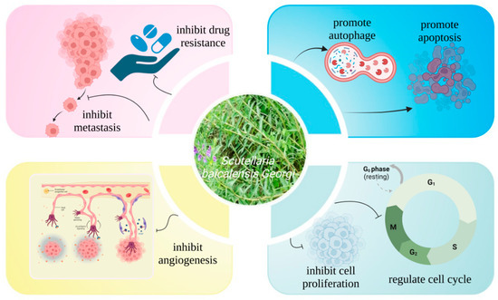 There is abundant evidence that SB and its flavonoids significantly inhibit tumour growth in both in vitro and animal studies. However, few clinical trials have confirmed their efficacy in cancer treatment and chemoprevention. To date, the effects of baicalein on cancer and normal cells and its mechanisms are not fully understood, the targets of action are unclear, and further research into targets for cancer therapy is needed. In addition, baicalein and baicalin are still difficult to use in clinical applications due to their low bioavailability, poor solubility and rapid metabolism.