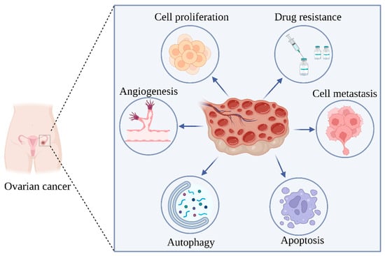Ovarian cancer (OC) is one of the most common and deadly cancers in women worldwide, with the highest mortality rate and the worst prognosis of all gynecological malignancies. Many women are diagnosed with OC each year, and the 5-year recurrence rate for advanced OC can be as high as 70% [1,2]. Based on histological and embryological features, there are three main types of OC: epithelial, germ cell and mesenchymal gonadotrophic, of which the epithelial type is the most common, accounting for over 90%, with the last two types accounting for only about 5% of all ovarian cancers [3]. Since the fight against cancer began, the mortality rate from OC has decreased only slightly compared to other malignancies. The most effective treatment modalities for newly diagnosed OC are currently surgical treatment with primary surgical cytoreduction and chemotherapy with post-operative drugs. However, in patients with advanced OC, chemotherapy often leads to resistance to chemotherapy drugs, leading to cancer recurrence in more than 50% of patients [4,5]. In addition to drug resistance, the toxicity of chemotherapeutic drugs is often a challenge in the treatment of OC. In addition to drug resistance, the toxicity of chemotherapeutic drugs is often a challenge in the treatment of OC. The anticancer activity of chemotherapeutic drugs is proportional to their concentration in a dose-dependent manner, but larger doses of chemotherapeutic drugs often produce severe toxic side effects. For patients with OC, the toxic side effects of the drugs undoubtedly increase the burden on the body, and it is, therefore, crucial to find new ways to reduce drug resistance and toxicity.