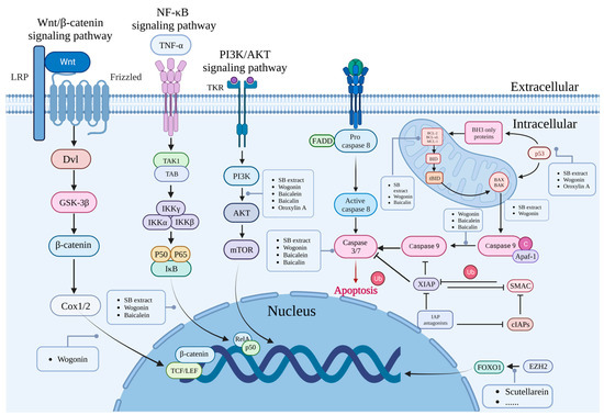 Some studies found that SB extract could inhibit cell invasion and regulate the cancer cell cycle. For example, treatment of OC cells with SB reduced the activation of NF-κB, inhibited the growth and invasion of cancer cells, down-regulated CXCR4 and MMP-9 in OC cells, and reduced the invasive potential of ovarian and endometrial cancer cells [110]. Besides, SB extract also activated caspase-3, caused G0/G1 phase cell cycle arrest, down-regulated cell cycle protein d1 and d3 expression, and up-regulated p27 expression, which affected the cancer cell cycle [111]. Besides that, SB extract induces apoptosis and enhances the cytotoxic effect of cisplatin. Using when 400 μg/mL SB extract and 30 μM cisplatin were simultaneously applied to sensitive and resistant cells, Chol et al. found that SB extract induced apoptosis by inducing the expression of p53, p21, Bax, Atg and Atg12 in the cisplatin-sensitive OC cell line A2780 [112]. SB extract also accelerated HIF-1α degradation through proteasomal and lysosomal pathways, PI3K/AKT and MEK/ERK pathways inhibited HIF-1α expression, reduced ABCG efflux proteins and enhanced cisplatin cytotoxic effects. Compared with baicalin extract alone, cisplatin-sensitive OC cells and cisplatin-resistant cells responded similarly to baicalin extract and cisplatin, and the results indicated that the combination of baicalin extract and cisplatin had a synergistic effect on cisplatin-resistant cells [111,112].