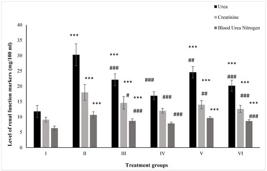 All the data are expressed as the mean ± the SD for urea, creatinine, and BUN in serum samples of the rats from: Group I (control); Group II (single dose of PB at 100 mg/kg); Group III (multiple doses of ZnO at 5 mg/kg); Group IV (multiple doses of ZnO-NP at 5 mg/kg); Group V (single dose of PB at 100 mg/kg with multiple doses of ZnO at 5 mg/kg; Group VI (single dose of PB at 100 mg/kg with multiple doses of ZnO-NPs at 5 mg/kg). The asterisk marks *** indicate statistically significant from the control (Group I) at p ≤ 0.05, p ≤ 0.01, and p ≤ 0.001, respectively, while #, ##, and ### indicate statistically significant from Group II at p ≤ 0.05, p ≤ 0.01, and p ≤ 0.001, respectively (n = 5–6).