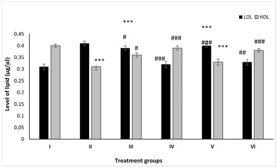 All the data are expressed as the mean ± the SD for LDL and HDL in serum samples of the rats from: Group I (control); Group II (single dose of PB at 100 mg/kg); Group III (multiple doses of ZnO at 5 mg/kg); Group IV (multiple doses of ZnO-NP at 5 mg/kg); Group V (single dose of PB at 100 mg/kg with multiple doses of ZnO at 5 mg/kg; Group VI (a single dose of PB at 100 mg/kg with multiple doses of ZnO-NPs at 5 mg/kg). The asterisk marks *** indicate statistically significant from the control (Group I) at p ≤ 0.05, p ≤ 0.01, and p ≤ 0.001, respectively, while #, ##, and ### indicate statistically significant from Group II at p ≤ 0.05, p ≤ 0.01, and p ≤ 0.001, respectively (n = 5–6).