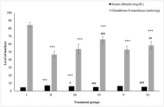 All the data are expressed as the mean ± the SD for albumin and GST in serum samples of the rats from: Group I (control); Group II (single dose of PB at 100 mg/kg); Group III (multiple doses of ZnO at 5 mg/kg); Group IV (multiple doses of ZnO-NP at 5 mg/kg); Group V (single dose of PB at 100 mg/kg with multiple doses of ZnO at 5 mg/kg; Group VI (single dose of PB at 100 mg/kg with multiple doses of ZnO-NPs at 5 mg/kg). The asterisk marks *** indicate statistically significant from the control (Group I) at p ≤ 0.05, p ≤ 0.01, and p ≤ 0.001, respectively, while #, ## and ### indicate statistically significant from Group II at p ≤ 0.05, p ≤ 0.01, and p ≤ 0.001, respectively (n = 5–6).