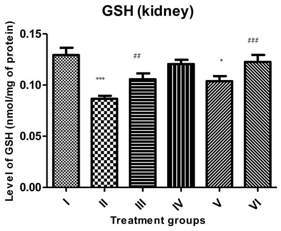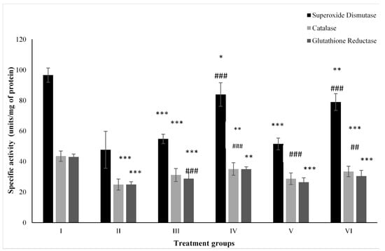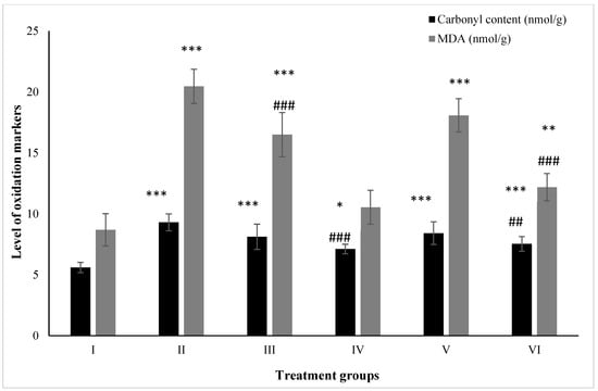All the data are depicted as the mean ± the SD and were analyzed by one-way ANOVA with Tukey’s post hoc multiple comparison test choosing a p-value ≤ 0.05 as statistically significant using the GraphPad Prism 5 software. *, **, and *** indicate statistically significant from the control (Group I) at p ≤ 0.05, p ≤ 0.01, and p ≤ 0.001, respectively, while #, ##, and ### indicate statistically significant from Group II at p ≤ 0.05, p ≤ 0.01, and p ≤ 0.001, respectively (n = 5–6).