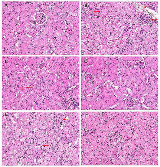 Photomicrographs of kidney cells from the treated rat groups stained with H& E snapped at 400× in serum samples of the rats from: (A) Group I (control); (B) Group II (single dose of PB at 100 mg/kg); (C) Group III (multiple doses of ZnO at 5 mg/kg); (D) Group IV (multiple doses of ZnO-NP at 5 mg/kg); (E) Group V (single dose of PB at 100 mg/kg with multiple doses of ZnO at 5 mg/kg; (F) Group VI (single dose of PB at 100 mg/kg with multiple doses of ZnO-NPs at 5 mg/kg). Black and red arrows point toward the major histological alterations in the tissue samples. In the figures, ‘d’ is for distal covulated tubules; ‘b’ for Bowman’s capsule; ‘g’ for glomeruli.