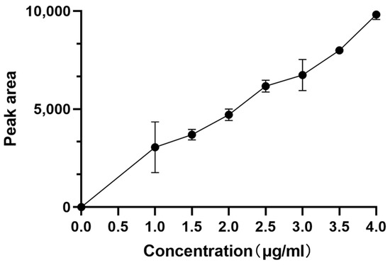 The Neferine standard was made by dissolving 5.03 mg of purified Neferine in 5 mL of methanol. Then, 1, 1.5, 2, 2.5, and 3 mL of the reference solution were accurately prepared and injected into HPLC for measurement. The standard curve (plot) was plotted with the peak area as the ordinate (Y) and the control concentration as the abscissa (X), and the linear regression equation was calculated as y = 4877.1x + 270.44, R2 = 0.996 (Figure 1). These results indicate that this standard curve is reliable as a reference.