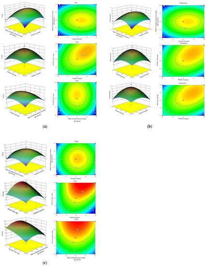 Optimization of the purification process of Neferine by response surface methodology. (a) Contour diagram of separation purity; (b) contour diagram of separation yield; and (c) contour diagram of separation yield.