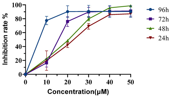 The cytotoxicity of Neferine was subsequently determined in HepG2 cells by the CCK-8 assay. Cells were treated with different concentrations of Neferine (16, 32, 48, 64, and 80 µM) for 24, 48, 72, and 96 h (Figure 3). The IC50 was shown to be 33.80, 29.47, 24.35, and 2.78 μM, respectively. These data suggested that Neferine could suppress the proliferation of HepG2 cells at a micromolar concentration after four days of treatment.
