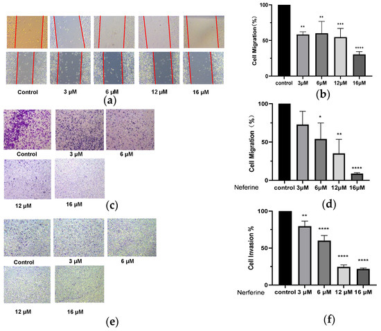 Effects of Neferine on migration and invasion of HepG2 cells. (a) After scratching the cells, Neferine at 3, 6, 12, or 16 μM was added for processing for 24 h of treatment. (b) Quantitative analyses of the scratch experiments. (c) Cells were treated with Neferine (3, 6, 12, or 16 μM) for 24 h, and (d) the effect of Neferine on the migration of HepG2 cells was assessed in a Transwell assay. (e) Cells were treated with Neferine at 3, 6, 12, or 16 μM for 24 h, and (f) the effect of Neferine on the invasion of HepG2 cells was assessed in a Transwell assay. * p < 0.05, ** p < 0.01, *** p < 0.001, **** p < 0.0001 vs. Control 4.