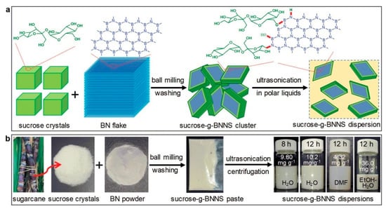 - Chen, S.; Xu, R.; Liu, J.; Zou, X.; Qiu, L.; Kang, F.; Liu, B.; Cheng, H.-M. Simultaneous Production and Functionalization of Boron Nitride Nanosheets by Sugar-Assisted Mechanochemical Exfoliation. Adv. Mater. 2019, 31, 1804810. [Google Scholar] [CrossRef]