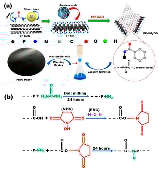 Elementary phosphorus is an efficient flame retardant, including red phosphorus [87,88] and black phosphorus [89,90]. Compared to amorphous red phosphorus, layered black phosphorus integrates not only the gas phase and condensed phase flame-retardant mechanism, but also the physical barrier effect, similar to graphene, which has drawn much attention in recent decades. Similarly, ball milling can be used to exfoliate black phosphorus into few-layer nanosheets called phosphorene [53]. The difference is that black phosphorus nanosheets are not stable in open air, and can rapidly degrade into phosphate compounds upon oxidation and hydrolysis. Therefore, for black phosphorus, exfoliation and subsequent protection are of equal importance. Qu and coworkers reported the preparation of aminated black phosphorene (BP-NH2) via the ball milling method [91], as shown in Figure 4. The graphene oxide (GO) was covalently bonded to black phosphorus through the reaction of -NH2 and -COOH in the presence of a catalyst. The obtained product was assembled into a flexible film (RPNG) with ultrahigh thermal conductivity and remarkable flame retardancy, which exhibited a fantastic application in fire alarm sensors. Along the same lines, they bonded the multi-walled carbon nanotubes (MWCNTs) to black phosphorus nanosheets via the -NH-CO- linkage [92]. The resultant nanofiller (BP-MWCNTs) could endow cellulose nanofiber (CNF) with satisfactory thermal conductivity and fire retardancy, specifically an in-plane thermal conductivity of 22.38 ± 0.39 W m−1 K−1, and a cross-plane thermal conductivity of 0.36 ± 0.03 W m−1 K−1, UL-94 V-0 grade, and a LOI value of 29.9%.