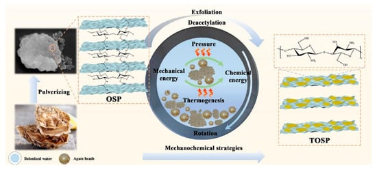Most recently, Chen and his group have focused their attention to recycling layered oyster wastes as flame retardants. The layered oyster consisted of 95% layered CaCO3, and 5% organic adhesives. However, the flame-retardant action of the bare oyster waste powders was unsatisfactory. Therefore, proper processing was highly desired in order to achieve the deconstruction and modification of layered oyster waste [100]. Firstly, they applied a simple ball milling of oyster powders, to obtain a phosphorus-free hybrid flame-retardant (TOSP), as shown in Figure 6. The successful exfoliation of layered oyster waste was confirmed. Moreover, the flame retardancy of the EP composite with the addition of milled layered oysters was investigated. This work opened a concept-new way to upcycle oyster waste, as high-value flame retardant, with the assistance of ball milling. To improve the flame-retardant ability of oyster wastes, the same group successively used ammonia phytate (PAA) [101] and chitosan-modified ammonium polyphosphate (CS@APP) [102] in assisting the ball milling-induced exfoliation of layered oyster wastes. This revealed that the resultant TOSP@PAA and TOSP@CS@APP were of a specific layer-crosslinking structure, by the –NH3+–O–P– bonds. As a result, the flame-retardant actions of TOSP@PAA for EP, and TOSP@CS@APP for cotton fabric, were higher than the common TOSP.