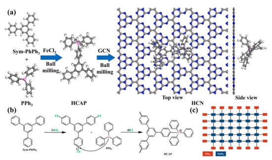 The heat and force generated by ball milling are sufficient for achieving some chemical reactions, including the solvent-free solid–solid reaction. Although it is not a dominant trend, there are indeed some reports on ball milling in the synthesis of novel flame retardants. Chen and coworkers reported a solvent-free ball milling method of fabricating phosphorus-containing hyper-crosslinked aromatic polymer (HCAP) from triphenylphosphine [112], as shown in Figure 8. Subsequently, nitrogen-rich graphitized carbon nitride was added, to synthesize a series of phosphorus and nitrogen-containing heterojunction flame retardants known as HCN. The molecular structures of HCAP and HCN were well characterized through experimental and computational approaches. The flame-retardant effect of HCN on EP resin was systematically investigated. It was found that the addition of 5 wt% HCN could endow EP resin with a UL-94 V0 rating, and dramatically reduce heat release and smoke production. Moreover, the machine learning method was performed, to evaluate the combined scores of multiple flame-retardant properties. It was believed that charring ability dominated the exceptional flame-retardant effect. This report displayed a brand-new pathway for developing high-performance flame retardants.