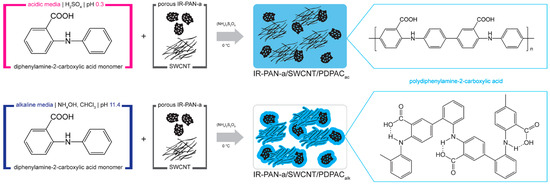 IR-PAN-a/SWCNT/PDPAC nanocomposites were synthesized in two different ways according to the synthesis method for IR-PAN-a/PDPAC in [59]. The content of IR-PAN-a and SWCNT was equal (CIR-PAN-a = CSWCNT = 10 wt% relative to the monomer weight).
