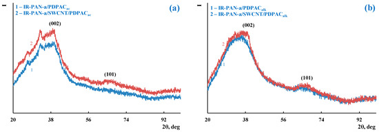 XRD of IR-PAN-a/PDPAC (1) and IR-PAN-a/SWCNT/PDPAC (2), prepared in an acidic (a) and alkaline media (b).