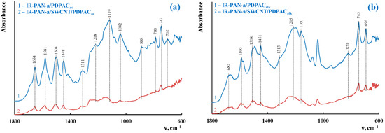Attenuated total reflection (ATR) FTIR spectra of IR-PAN-a/PDPAC (1) and IR-PAN-a/SWCNT/PDPAC (2), prepared in an acidic (a) and alkaline media (b).