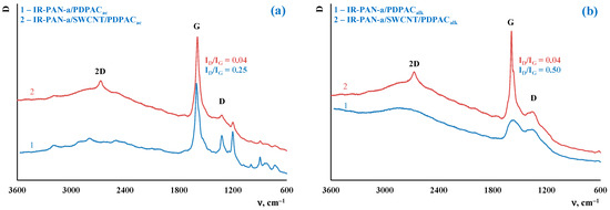 Figure 4 shows the Raman spectra of the IR-PAN-a/PDPAC and composites prepared using two methods. As can be seen, in the Raman spectra of IR-PAN-a-based composites, there are two pronounced G and D bands. A G band at ~1596 cm−1 characterizes sp2 carbon atoms. A D band at ~1339 cm−1 corresponds to sp3 carbon atoms. The G band is a distinctive feature of graphite structures, whereas the D band is associated with disordered and defective structures [43]. The intensity ratio of these bands in the Raman spectrum of neat IR-PAN-a is ID/IG = 0.91 [59]. The splitting of the G and D bands in the Raman spectra of the binary and ternary composites is associated with the presence of a polymer component. In the IR-PAN-a/SWCNT/PDPAC, the intensity ratio of the ID/IG decreases to 0.04 regardless of the method of obtaining composites due to sp2 carbon atoms of SWCNT.