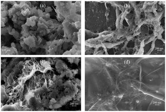 FE-SEM images of IR-PAN-a/SWCNT/PDPACac (a), AGF/IR-PAN-a/SWCNT/PDPACac (b), IR-PAN-a/SWCNT/PDPACalk (c) and AGF/IR-PAN-a/SWCNT/PDPACalk (d).