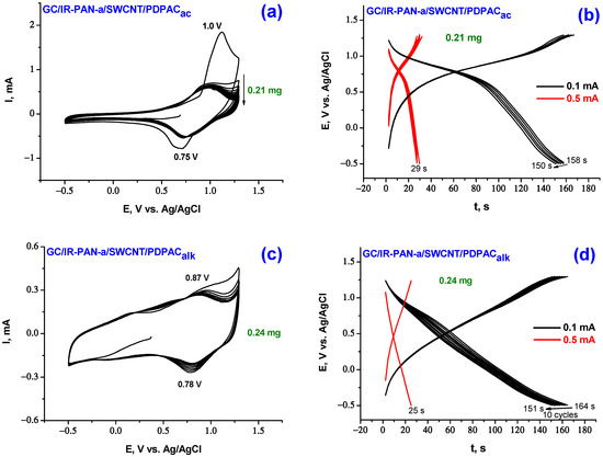 The comparison of CV of ternary nanocomposites obtained in different media in the simultaneous presence of IR-PAN-a (10 wt%) and SWCNT (10 wt%) (Figure 6a,c) shows that the capacitance of the IR-PAN-a/SWCNT/PDPACalk nanocomposite coating on GC is determined by a larger contribution of double-layer charge-discharge. This is expressed in a sharp increase in the area of CV in the range of potentials from −0.5 to +0.6 V. Whereas the capacitance of IR-PAN-a/SWCNT/PDPACac is determined by a larger contribution of the Faraday pseudocapacitance. These features are also manifested in the shape of charge-discharge curves (Figure 6b,d).