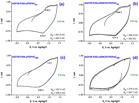 CV curves on the electrodes of AGF/IR-PAN-a/PDPACac (a), AGF/IR-PAN-a/SWCNT/PDPACac (b), AGF/IR-PAN-a/PDPACalk (c) and AGF/IR-PAN-a/SWCNT/PDPACalk (d) at 5 mV·s−1.