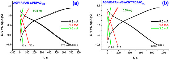 Specific surface capacitances Cs of AGF-based electrode materials in 1 M LiClO4 in propylene carbonate calculated from CV are given in Table 2. For ternary nanocomposites, as compared to binary ones, the capacitances increase from 0.135 to 0.151 F∙cm−2 (by 12% for IR-PAN-a/SWCNT/PDPACalk) and from 0.129 to 0.161 F∙cm−2 (by 25% for IR-PAN-a/SWCNT/PDPACac). Coulombic charge-discharge efficiency ŋ of AGF/IR-PAN-a/PDPAC and AGF/IR-PAN-a/SWCNT/PDPAC electrodes is close to 100%.