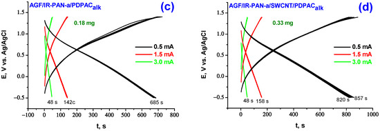 Galvanostatic charge-discharge dependences of the electrodes of AGF/IR-PAN-a/PDPACac (a), AGF/IR-PAN-a/SWCNT/PDPACac (b), AGF/IR-PAN-a/PDPACalk (c) and AGF/IR-PAN-a/SWCNT/PDPACalk (d) at 0.5, 1.5, 3.0 mA∙cm−2.