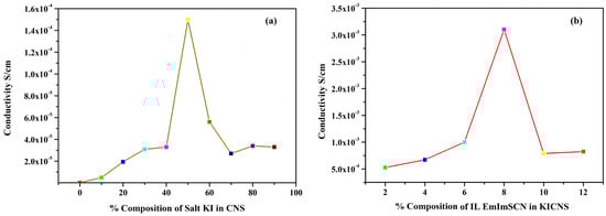 where Rb is the bulk resistance, L is the thickness, and A represents the area of the electrode used to sandwich the films. The thickness of both the KIBPE and ILBPE films was between 0.014 cm and 0.018 cm. The overall conductivity values of all films, determined using EIS measurements, are tabulated in Table 1 and plotted in Figure 1. Thus, it is clear that for both the BPE and ILBPE systems, the conductivity increased initially, attained maxima, and then decreased. In KIBPEs, we have achieved the conductivity maxima at 50 weights % concentration of KI with a conductivity value of 1.50 × 10−4 S/cm (Figure 1a), whereas in ILBPEs, we achieved the highest conductivity at 8 weight % concentration of IL with a conductivity value of 3.10 × 10−3 S/cm (Figure 1b). Single maxima as well as double maxima in dispersed polymer electrolyte systems have already been cited in the literature, where conductivity enhancements are due to additional charge carriers; lower maxima indicate the formation of charge pair ions [32,33]. Maximum conducting ILBPEs were sandwiched between the electrodes to fabricate EDLCs and DSSCs. In ILBPEs, the extant studies are restricted to a 12 weight% IL concentration due to the non-availability of free-standing biopolymer electrolyte film.