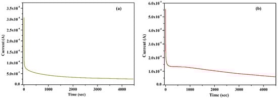 Wagner’s DC polarization method was applied to measure the ionic transference number of the highest conducting KIBPE and ILBPE films. A low DC voltage amplitude was applied across the film for 4500 s, as shown in Figure 2a,b. Initially, the current dramatically increased, then rapidly decreased over time, and finally stabilized. The stabilization of the current was due to the occurrence of electrode polarization upon the application of DC potential, which caused the deposition of ions across the electrode. The ionic transference number (tion) was calculated using Equation (2) using the data evaluated from Figure 2.