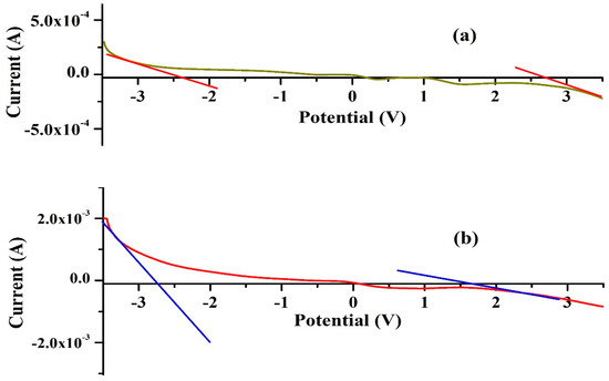 The linear sweep voltammetry (LSV) technique was applied within a symmetrical voltage range of −3.5 V to 3.5 V to evaluate the electrochemical stability window (ESW) of the highest ionic conducting KIBPE and ILBPE films at a scan rate of 10 mV/s. Figure 3 shows the increase and decrease in the value of the current when the voltage ranged from −3.5 V to 3.5 V. For both the electrolyte films, it was observed that the value of the current decreased rapidly and tended to stabilize within their potential range. The region where the current tended to stabilize is known as the ESW of the films. ESWs of 5.16 volts (Figure 3a) and 4.3 volts (Figure 3b) were calculated for KIBPE and ILBPE, respectively. A high stability of 4.3 volt will definitely favor the fabrication of electrochemical devices.
