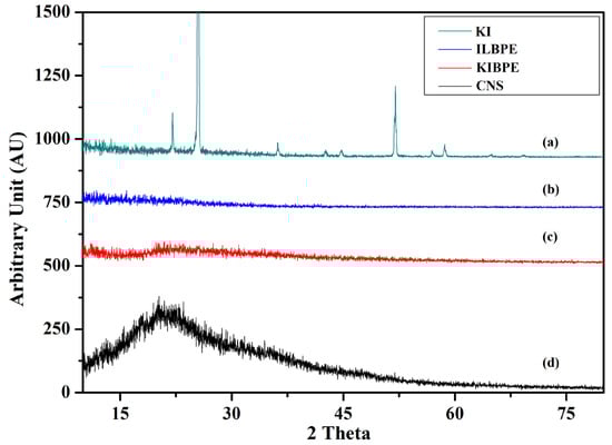X-ray diffraction pattern of (a) KI, (b) ILBPE, (c) KIBPE, and (d) CNS.