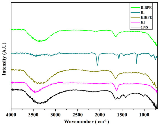 FTIR spectra of CNS, KI, IL, KIBPEs, and ILBPEs.