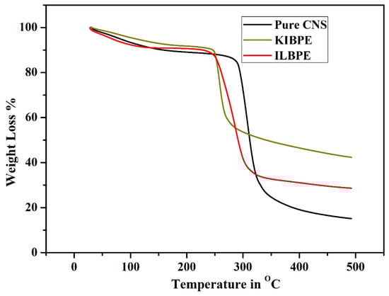 Figure 7 shows the thermogravimetric analysis (TGA) results of pure CNS, KIBPE film, and ILBPE film; the TGA was performed within a temperature range from 30 °C (room temperature) to 500 °C (high temperature). From Figure 7, it is evident that all the three different films suffered initial weight loss up to 100 °C, which is due to the presence of traces of manure in DD water within the films. The pure CNS film was stable up to a temperature of 280 °C; KIBPE and ILBPE films were stable up to a temperature of 250 °C. Weight loss at higher temperatures is due to pre-carbonization and high-temperature reactions. The higher temperature stability of the KIBPE and ILBPE films indicates their suitability for application in devices at normal operating temperature, as well as extreme temperature conditions.