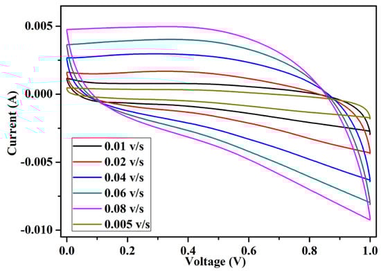 The cyclic voltammetry (CV) technique was performed for the fabricated EDLC to study the charge storage mechanism. In this technique, a linear sweeping voltage varying between 0 and 1 V was applied across the EDLC cells at scan rates of 0.005 v/s to 0.08 v/s (Table 3). The cyclic voltammetry graph is plotted in Figure 9. The cyclic voltammogram plots are quite rectangular in shape, with some inclination toward the y-axis (current). The inclination was identified in the EDLC while sweeping from 0 to 1 volts and 1 to 0 volts. The inclination region was due to the charging and discharging of the capacitor. The perfect rectangular CV shape was only achieved using conventional dielectric capacitors. The specific capacitance values (Csp) at different scan rates of the EDLC cell were also calculated using Equation (4), where A is the average area under the curve, V is the voltage window, and S is the scan rate. The specific capacitance values were calculated, as detailed in Table 3.