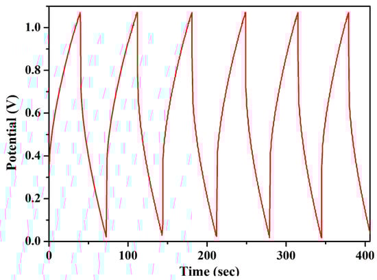 Constant current charging and discharging (CCD) was carried out for the EDLC at a constant current of 4 mA and in a relative charging and discharging potential window of 1.06 volt. The first five cycles of all EDLC cells are plotted in Figure 10. The charge–discharge curves of all EDLC cells contained a linear region, varying with time, for both the charging and discharging cycles. Various necessary parameters of the EDLC cell, such as discharge specific capacitance (Cdsp), coulombic efficiency (Cef), specific energy density (Ed), and specific power density (Pd) were calculated using Equations (5)–(8), where I is the applied constant current for charging and discharging, Dt is the discharge time, V is the relative discharge potential, and Ct is the charging time. The EDLC cell could deliver a specific discharge capacitance of as high as 200 F/g, a coulombic efficiency higher than 80%, an energy density as high as 35 Wh/kg, and a power density of 4080 W/kg. The EDLC delivered promising results, which proves its potential over existing electrolytes.