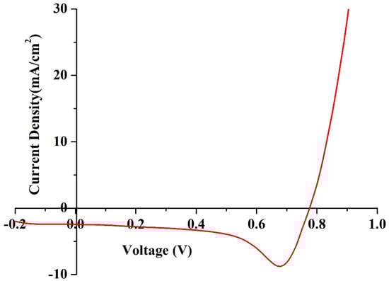 The J–V characteristics of DSSCs were recorded using a solar simulator to measure the overall performance and charge transfer mechanism. In this technique, a sweeping voltage is applied across the working and counter electrodes of the DSSC, irradiated at a condition of one sun (1000 W/m2) and at a scan rate of 0.1 v/s. The value of the current density with respect to voltage was recorded, and the J–V curve was plotted, as shown in Figure 11. Key parameters of fill factor (FF) and photon conversion efficiency (η) were calculated using the formulae presented in Equations (9) and (10), respectively, where Voc is the open circuit voltage, Jsc is the short circuit current, Vmax is the peak voltage, and Jmax is the peak load current. The DSSC was able to deliver an η of 1.53% with an FF of 72. The DSSC also generated Voc, Jsc, Vmax, and Jmax values of 0.77 V, 2.43 mA/cm2, 0.76 V, and 2.02 mA/cm2, respectively.