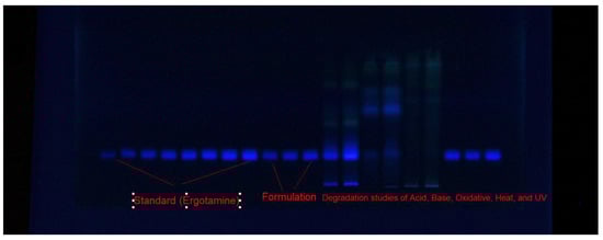 A typical TLC plate for standard EGT, commercial product, and forced-degradation samples obtained utilizing eco-friendly EtOH–H2O (80:20 v/v) mobile phase under fluorescence mode for the present approach.